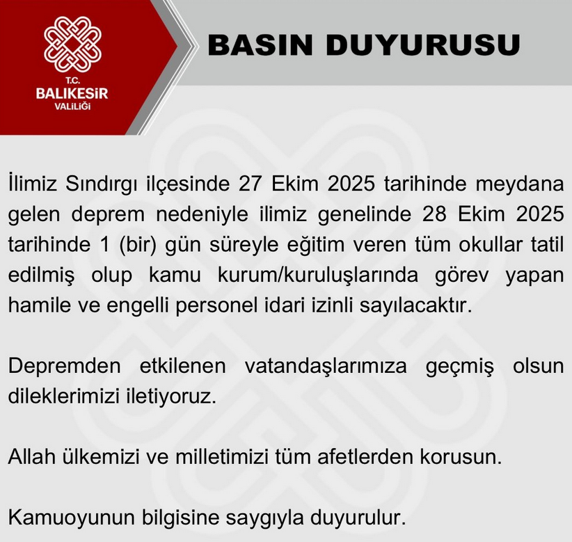 Balıkesir Valiliği tarafından yapılan açıklamada, 28 Ekim Salı günü tüm okullarının tatil edildiği, kamu kurumlarında görev yapan hamile ve engelli personelin de idari izinli sayılacağı kaydedildi.